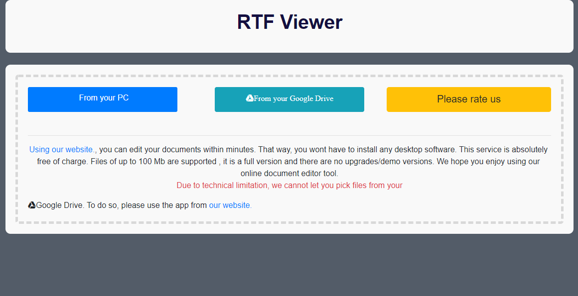 You can edit your documents within minutes. That way, you wont have to install any desktop software. This service is absolutely free of charge. Files of up to 100 Mb are supported , it is a full version and there are no upgrades/demo versions. We hope you enjoy using our online document editor tool.